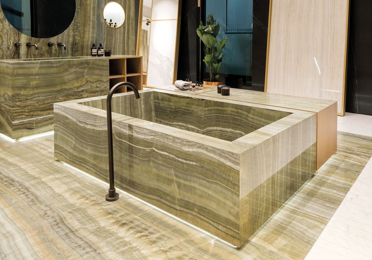 A tub carved from Siberian jade, its curved base contoured for acupressure benefits. The stone’s far-infrared rays purportedly detoxify water, paired with a heated jade pillow rest.