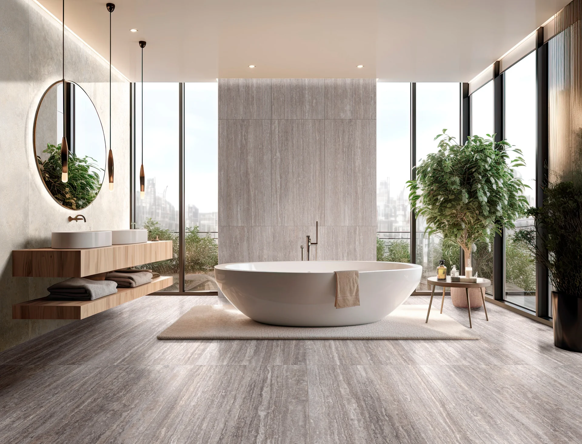 Crosscut travertine tiles in 60x120cm formats, revealing concentric banding patterns. Filled pores and slip-resistant finishes adapt to pool decks or rustic-chic cafes. Grout lines tinted with terracotta pigments for cohesion.