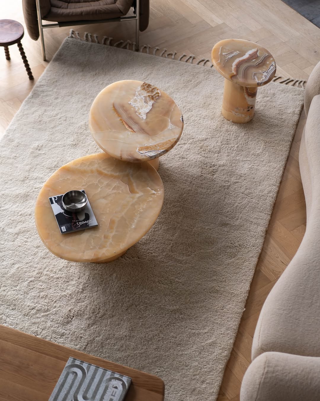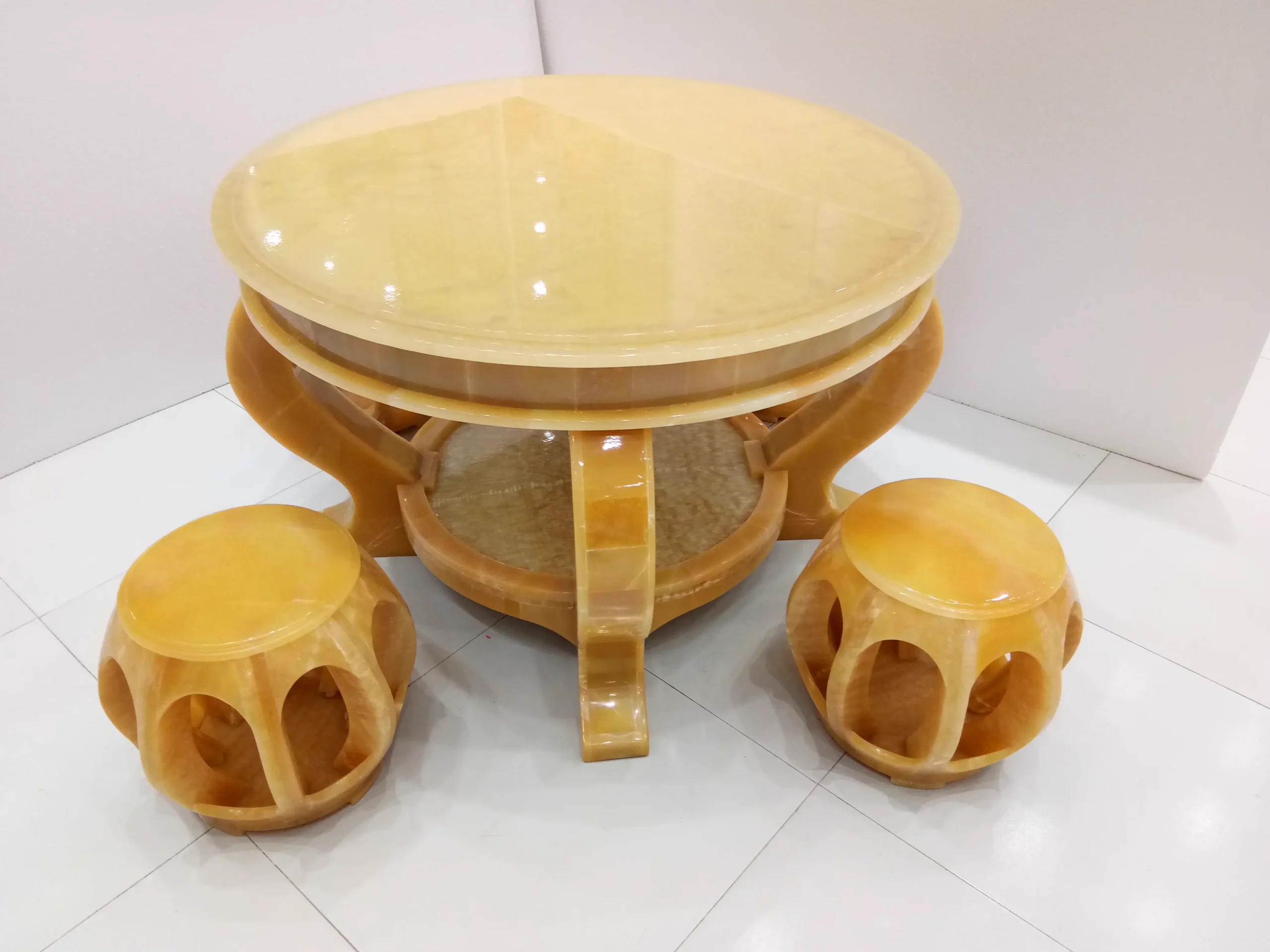 A garden set of jadeite tablets on bronze legs, their surfaces naturally cooled for summer lounging. Carved peony motifs on chair backs blend artistry with ergonomic support.